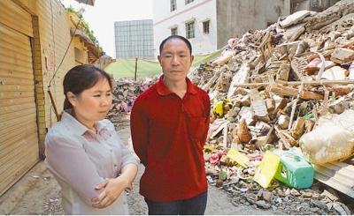 图为姬远奎夫妇站在废墟前讲述事发经过。人民视觉
