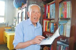 问明来意,赵培成不再多言,挥挥手将笔者带到位于屋内二楼的一间“工作室”。笔者看到这处家具摆设“简陋”的屋内,最抢眼的摆设就是一套老式六门书柜,上面摆放的各种资料书籍已将柜隔断压得弯曲。赵培成告诉笔者,由于其常年伏案工作,落下了腰疼的病根,现在已无法坐在写字台前写字,后期的所有书稿都是靠趴在平柜旁站着书写,如此而言是真实版“扶案”工作了。