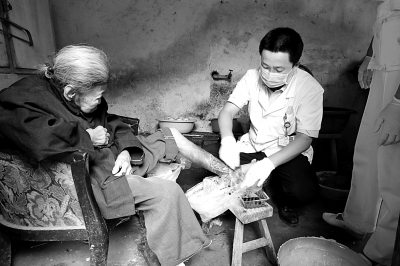 万少华为细菌战受害者崔菊英老人换药。张桂芬供图