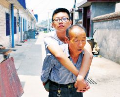 父亲连喜祥15年如一日背着儿子连超上学。本报通讯员摄