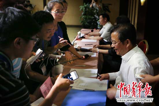 8月19日,天津,天津港“8·12”瑞海公司危险品仓库特别重大火灾爆炸事故第九场新闻发布会后,记者追问天津港集团有限公司总裁郑庆跃,这是他首次亮相发布会。 本报记者 赵迪/摄