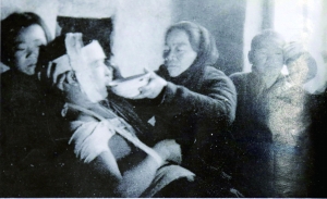1942年的老照片中,短发小女孩刘敬影(左一)帮着妈妈李杏阁(左三)给八路军伤员喂饭。