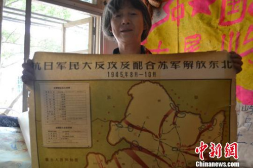 30日,谭翠兰向记者展示抗日军民大反攻及配合苏军解放东北的军事地图。 苏路程 摄