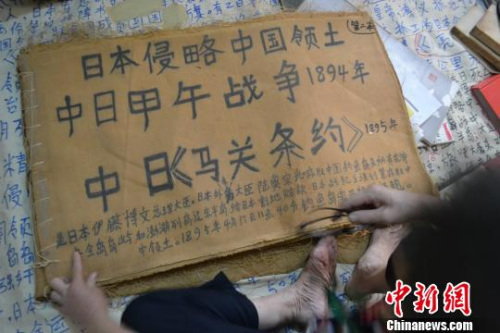 30日,谭翠兰在整理自己在麻布上誊写摘抄的《甲午中日战争》。 苏路程 摄