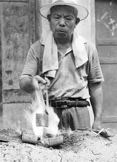 胡二春16岁时扛起大锤跟着爷爷和父亲学打铁,练得一手精湛的打铁手艺,赢得十里八乡乡亲们的夸赞。上世纪八十年代中期,最辉煌的时候,胡二春收了十多个徒弟,拥有三部空气锤,成为当地最大的打铁专业户。随着机械制造业的迅猛发展以及打工潮的兴起,徒弟们受不了打铁的辛苦,纷纷外出打工,老式的农具、家庭用具也被冷落,铁匠铺的生意逐渐冷清下来,随着年龄的增大,老胡也不再从事打铁手艺了。但是,看到乡亲们损坏的农具、家庭用具等,扔了可惜,修又无处修理,2015年初,胡二春在家门口支起简陋的铁匠炉,重操打铁手艺。胡二春说:“不为挣钱,就为方便乡亲们!” (彭飞)