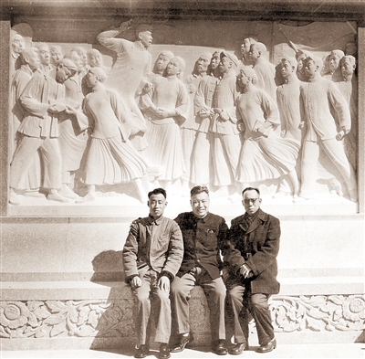 ▲著名雕刻家滑田友(中)与曲阳雕刻师刘秉杰(左)和冉景文在一起。