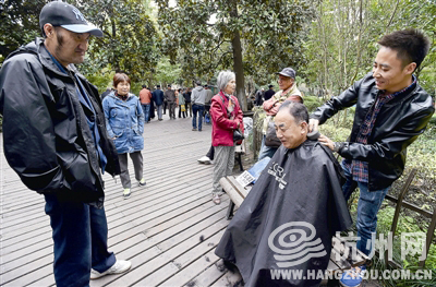 昨天,记者公园木板平台看到,很多人围着一个理发摊,这是在干吗呢?