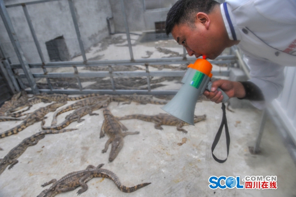 四川在线消息(四川日报记者 吴传明 摄影报道)11月30日,当记者走进都江堰市胥家镇彭(州)青(城山)路圣寿村段,被公路边的一块巨石上雕刻的鲲鹏鳄鱼养殖有限公司的鳄鱼景观所吸引,放眼望去,鳄鱼雕塑,鳄鱼展示、鳄鱼宴席图片让人目不接暇。一位30多岁的年轻小伙子徐富荣,热情地将我们引进鳄鱼馆,目睹了他养殖的300多条来自亚热带地区的鳄鱼在凉爽的都江堰市过着“温暖”的冬季生活。