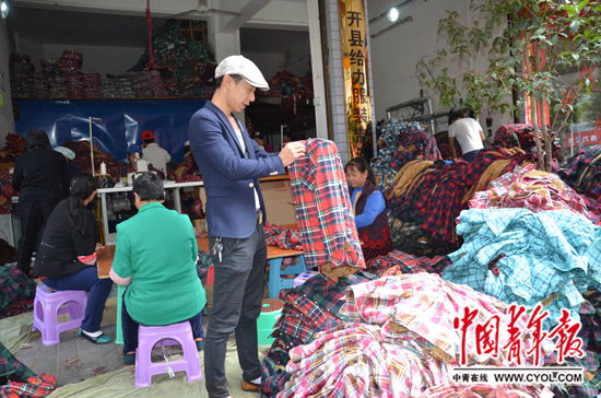42岁的周圣富(中),外出打工10年后,返乡创业,成立了两个公司,另有6家公司为其代工,建成了3个网络分销平台,有2000多个网络分销商,每年能卖出他的公司生产的七八十万件格子衬衣。