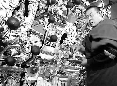 坚赞华藏在安装已经完成的酥油花作品