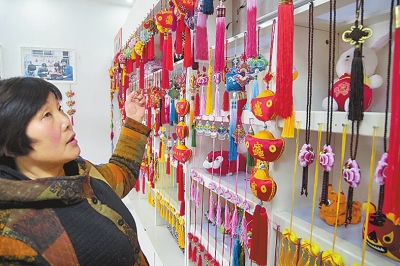 12月26日,汝阳县三屯镇丁沟村李水琴注视自己的香包产品。李水琴靠卖香包在洛阳开了门店,还注册了“李阿婆”商标。今年她返乡办起了“李阿婆香包厂”,带领百姓脱贫。⑤3本报记者 王天定摄