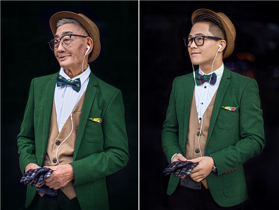 爷孙俩换上相同的服装,摆出同样的动作。看,爷爷重返30岁。