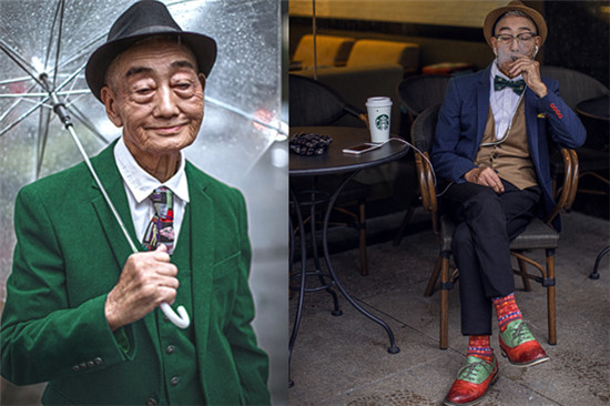 当丁炳才换上考究的服饰后,瞬间起了范,举手投足间气场十足,成了“中国最时尚的老爷爷”。