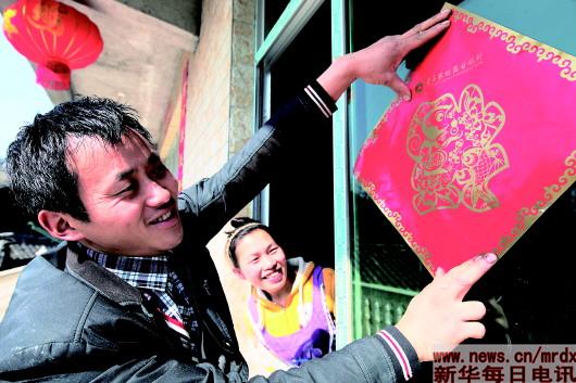 2月7日,在重庆市黔江区太极乡石槽村,徐超廷的儿子、儿媳给新居贴“福”字。徐超廷左手残疾,妻子多病。2014年政府对他家进行产业扶持。2015年底,徐超廷一家实现脱贫。这是徐超廷一家迁进新居后过的第一个春节。 新华社发(杨敏摄)