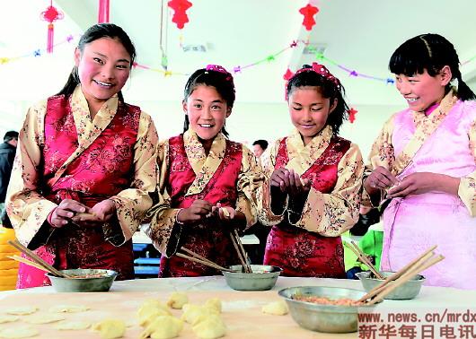 2月7日,拉萨西藏特殊学校的孩子们在老师的带领下包饺子,迎接春节和藏历新年。新华社记者觉果摄