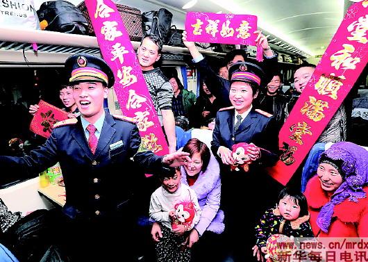 2月7日,农历除夕,上海铁路局上海客运段的乘务员与旅客在Z164次列车上的“猴年春晚”上互动高歌。新华社记者陈飞摄