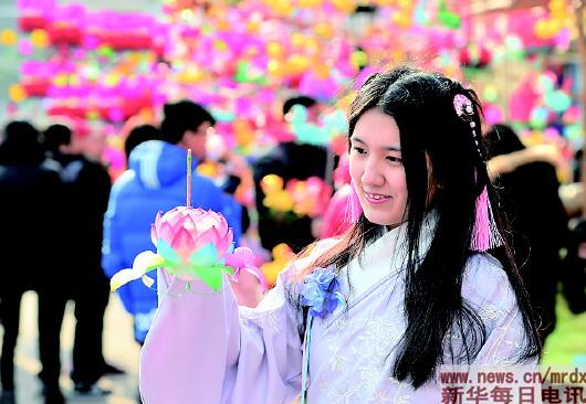 2月7日,南京第30届秦淮灯会的灯市开市,一名身着汉服的市民选购了一盏荷花灯。新华社记者孙参摄