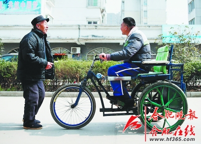 脑瘫的孙子骑着特制的三轮车,一步步挪行。爷爷佝偻着身子,站在车前,面对着孙子,一边倒着走路,一边为孙子打手势指引方向。在蜀山区小庙镇旺兴街上,总能看到这一老一小两个身影。20年来,爷爷孙鹏每天都要这样陪伴着孙子倒行8公里,风雨无阻。“因为这样我能看到希望。”75岁的老人孙鹏说。