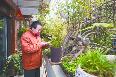 程生达正在细心呵护自家阳台上的花草,春日暖阳下的阳台郁郁葱葱 记者胡九思 摄