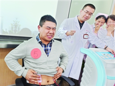 体验由1级开始。准爸爸们可随时对疼痛“加级”或者“喊停”,戚忠则立刻按他们的要求操作。