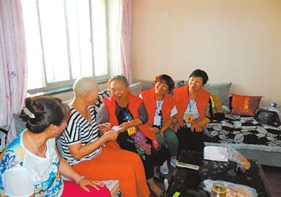 这支队伍里,带头人叫贾玉凤,今年53岁,带领队员经常参加各种志愿服务活动。贾玉凤身高不到1.6米,身材圆润,笑起来眼睛弯弯的,感觉特别和蔼可亲。“2009年4月,我感觉胸部不太舒服,周末到医院做了次检查,医生说情况不太好。”她回忆道,医生让她第二天就住院,准备手术,术后确诊她患了乳腺癌。自此,她开始了长达8个月的化疗。因为癌细胞已经转移到淋巴,化疗结束后又进行了放疗。“小儿子为了照顾我,把工作都辞了,现在我好了,小儿子却一直在外打零工。”提起自己的小儿子,原本满面笑容的贾玉凤不禁落泪,她感觉自己非常对不起儿子。不过,家人的支持给了她巨大的力量,因为当初医生说她的生命只剩下3个月。
