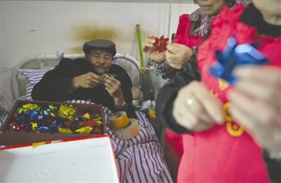 13日,76岁的“风车爷爷”胡远根正在病床上制作风车