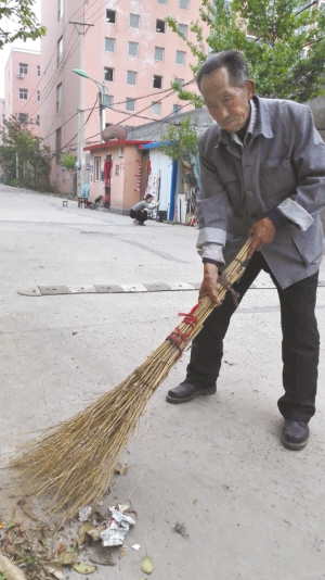 癌症老人每天打扫院落。本报记者 王彬 摄