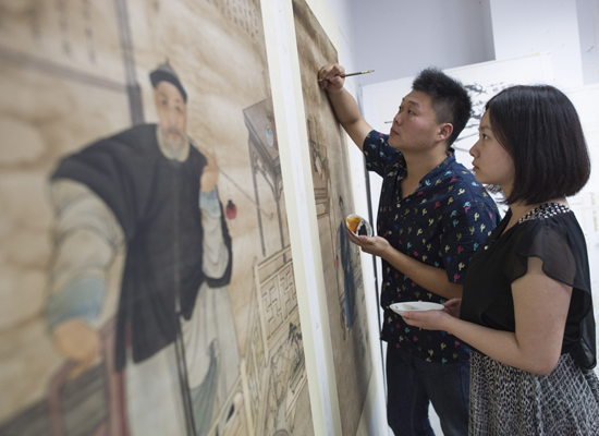 5月16日,赵晓龙与妻子张晓珑对一件文物进行修复。