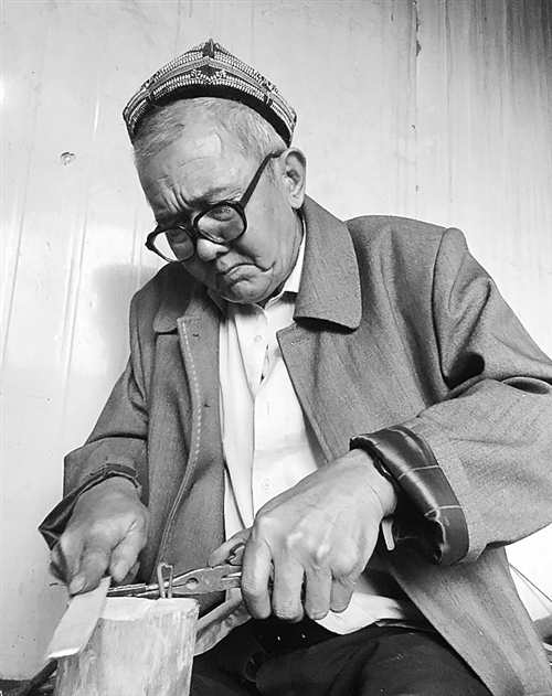 双眉紧锁,目光如炬,热合曼·塔石将全部身心专注在一把刀上。磨刃、瞄视、吹气,再磨刃、再瞄视、再吹气……直至刀刃如线、泛着银光,他才露出一丝微笑,摘下眼镜,喝一口浓茶,开始与《经济日报》记者讲述自己与刀的故事。