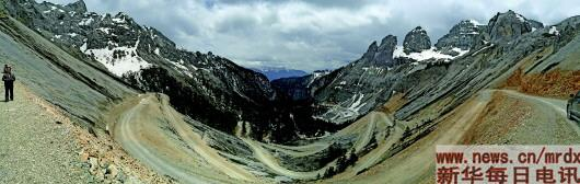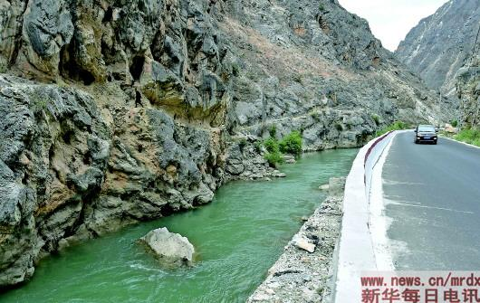 这是香格里拉大峡谷巴拉格宗景区内的高山和峡谷之间由斯那定珠出资修建的道路(手机拍摄,5月8日摄)。新华社记者钱彤摄