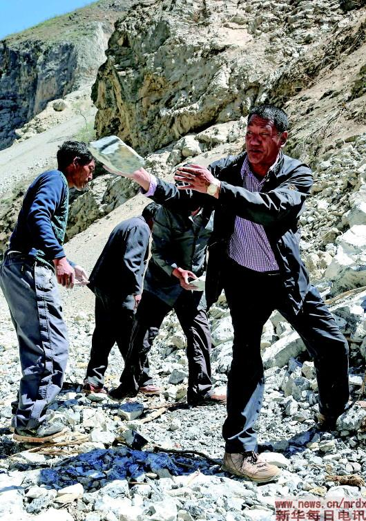 斯那定珠(右一)和工人一起修建香格里拉大峡谷内的公路(2013年9月13日摄)。新华社发