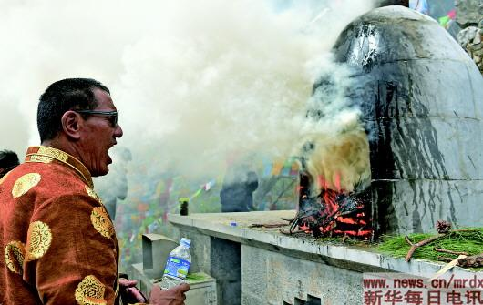 斯那定珠在香格里拉大峡谷内的巴拉村煨桑(5月8日摄)。 新华社记者王长山摄