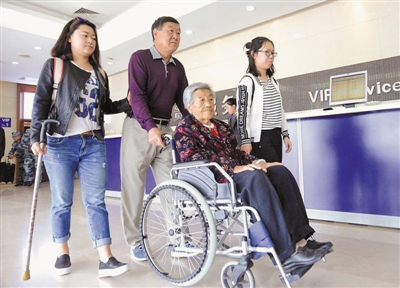当天13时,王金宝陪着母亲,与女儿和外甥女在机场拍了张合影,在欢呼声中出发了。(本报记者 张涛 文/图)