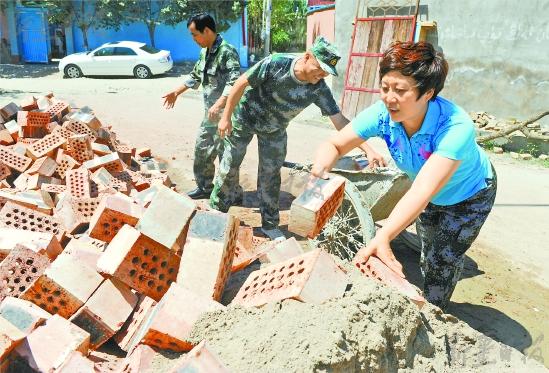 7月8日,霍城县水定镇朝北社区一户在建民房的施工工地上,社区党支部书记陆慧正带着社区党员志愿者服务队搬运砖块。“房主是我们社区的一位孤寡老人,住房年久失修,我们与县住建局安居办联系争取到了资金,正在为她建一套23平方米的抗震安居房。”陆慧给记者介绍说,“为了节省资金,只请了大工,社区党员志愿者服务队的队员轮流做小工,尽快让老人住进新房。”