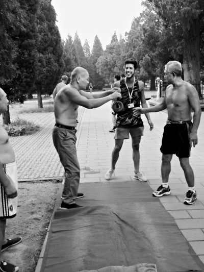 早上9点,一个外国旅行团刚进入东门,就被老人们锻炼的声音吸引了过来。看到外国朋友的到来,老人们把自己的绝活展现得更是淋漓尽致,大回环、小回环、软功……在一系列眼花缭乱的表演后,外国朋友不由得竖起大拇指发出了由衷地赞叹:“It's amazing(真令人吃惊)!”在看到身旁几个年轻的外国小伙有些跃跃欲试后,大爷们热情地带着他们来到了健身器械旁,展开了比赛。几个回合下来,最终胜利的都是中国大爷,但外国小伙的勇气还是得到了老人们的肯定,这场小型的比赛也在充满欢声笑语的合影中结束。