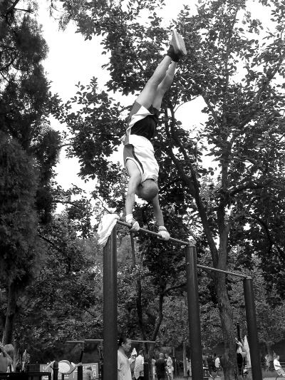 有人的地方就有江湖,有江湖的地方就有“神功”。天坛公园里就有这样一个健身的“江湖”。在这里,一群平均年龄60岁以上的大爷们用超越年龄的力量在单杠、双杠上自如旋转,凭借劈叉、俯卧撑和大回环等“神功”,他们让不少年轻人都甘拜下风。