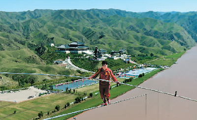 8月26日,在宁夏回族自治区青铜峡市黄河大峡谷,新疆达瓦孜第六代传人“高空王子”阿迪力成功完成横跨黄河高空走钢丝,并创下新的无保护高空走钢丝1800米的最长距离吉尼斯纪录。