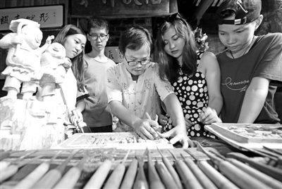 9月5日,江西上饶,婺源县乡村艺人、“徽雕”非遗项目传承人余晓群在为武汉理工大学的122名师生教授木雕制作工艺。