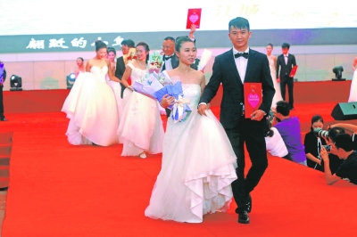 参加集体婚礼的夫妻们拿着婚礼证书走上红毯。记者杨少昆 摄