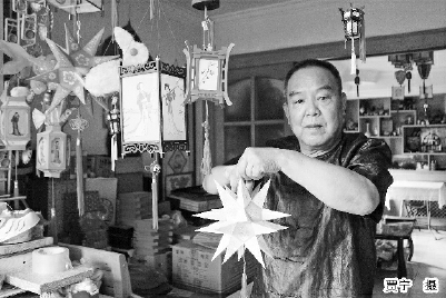 走进张双志的家,只见天花板上悬挂着色彩斑斓的宫灯;门楣挂满造型各异的“蒺藜灯”,宛如一道不规则的门帘;书柜上竖立着面人、毛猴等各种非遗作品;墙壁上挂着一副字迹清秀的书法“北京小灯张”;窗外还时不时地再传来几声啁啾鸟鸣……整个家犹如一座微型的民俗民间工艺品展览馆,让人感受到浓郁的老北京味儿。不过,在“小灯张”亲手制作的这些民俗工艺品中,最抢眼的当然要数形形色色、形态各异的宫灯了。