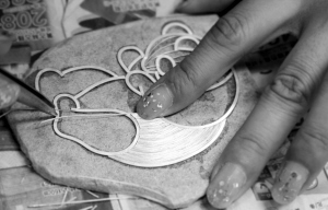 夏日,为了让工人在无空调、无风扇环境下稍微舒适一点,道安把新工作室选在了青羊大道某小区的一楼,“地下室带天井,通风却不直吹,焊接的时候稍微好点儿。”每每放下手中的焊接火焰枪,道安总是满脸通红,因为长时间的高温焊接,她的脸也长期处于过敏状态。焊接工序是整个银花丝技艺中最难的步骤,因为银的热胀冷缩特性尤为明显,所以在银花丝立体摆件的焊接过程中,容易造成作品的变形;如果焊接材料的配方不好,还会出现明显的焊点。“要处理好变形的问题,就需要艺人非常有经验,同时还需要掌握焊接材料的独家配方。”