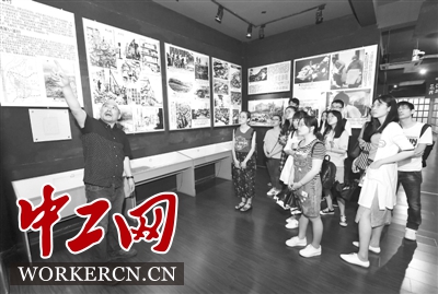 吴先斌(左一)在博物馆展厅向一批大学生观众介绍日军在南京的暴行(6月24日摄)。