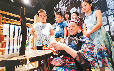 7月27日,来自贵州省台江县台拱镇的中国手工坊签约绣娘潘玉珍在北京丰台园博园内向观众展示苗绣手艺。借助“互联网+手工艺”的精准扶贫模式,北京市丰台区相关单位推出的中国手工坊项目为贫苦山区及少数民族地区1000多名绣娘开拓了订单承接与产品销售渠道,让大山深处的贫困妇女足不出户就能稳定脱贫。