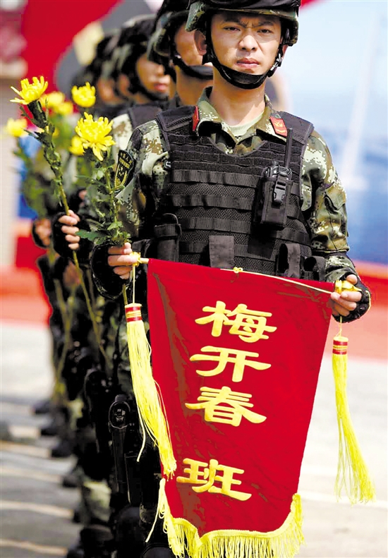 “梅开春班”旗帜被授予机动大队三中队三班,英雄精神代代相传 廖键 摄