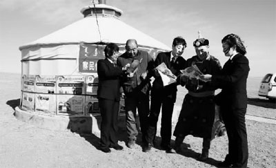 潘志荣(中)与干警一起深入牧区为牧民普法。新华社发(高顺华摄)
