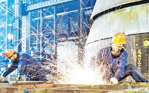 10月1日,在河南省洛阳市中信重工铆焊车间,工人在焊接矿用磨机筒体的加急配件。黄政伟摄(新华社发)