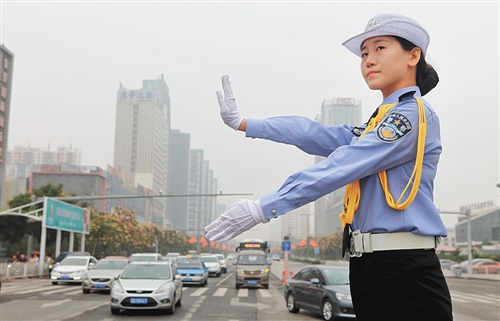 10月1日,河北邯郸市公安局交通警察支队渚河大队民警在指挥交通。 新华社记者 王 晓摄