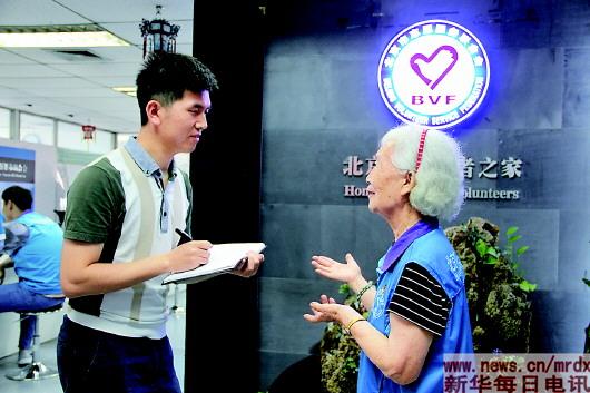 ▲胡振华在北京市志愿服务联合会采访高龄志愿者蔡秀兰。