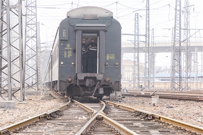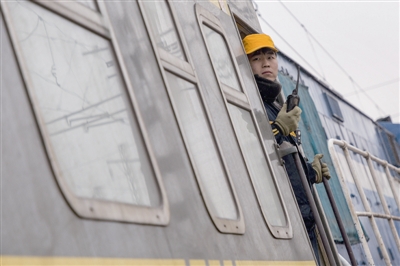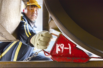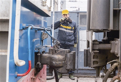 春寒料峭,普集路15号的客车整备场分外清冷。早上8:30,张凯指挥调车机和一列需要甩挂的列车稳稳连结在一起,随身记录仪将工作流程全记录下来,然后张凯将列车车轮下的“三防铁鞋”取下来,再次用记录仪记录下当前解挂列车的车次。每一次甩挂作业除了用记录仪记录下来外,还要用手势和口语进行再次确认,这样就能保证每一次甩挂作业都准确无误。