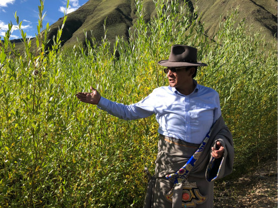 昂江多杰向记者介绍培育成功的藏柳树苗 (余璐 摄)